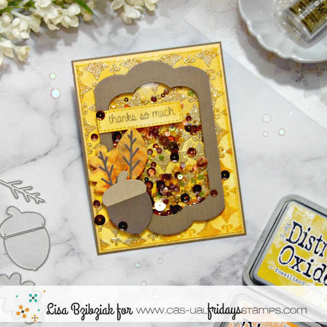 I cut out the leaves and acorn using the Acorn Dies (also half off in the clearance section!). I cut the leaves from some previously colored cardstock where I used a shaving cream technique. The tone wasn't quite right so I blended some more of the Fossilized Amber ink over the top and it was perfect! I added them over the top of the shaker element using some thin foam tape.