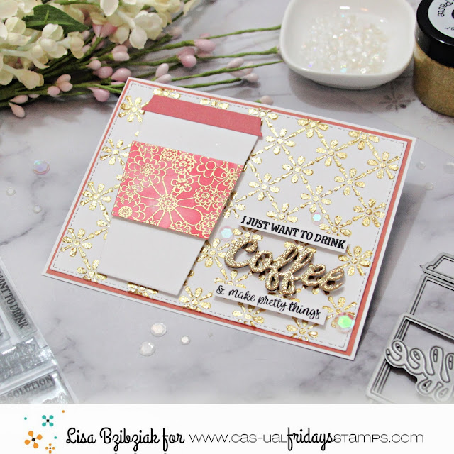 One of my favorite die sets from the shop is the To Go Cup Dies! The wrap was cut from a previously blended and embossed piece (using the Full On Floral Stamp Set) that I saved because of course I would! I used the colors in it to cut the cup lid and one of the base panels. I cut the Coffee word die from the Coffee Cup die set from gold glitter paper and twice more from plain cardstock and stacked them together. Then I stamped the sentiment pieces from the Coffee Talk stamp set and cut them in strips.